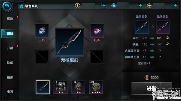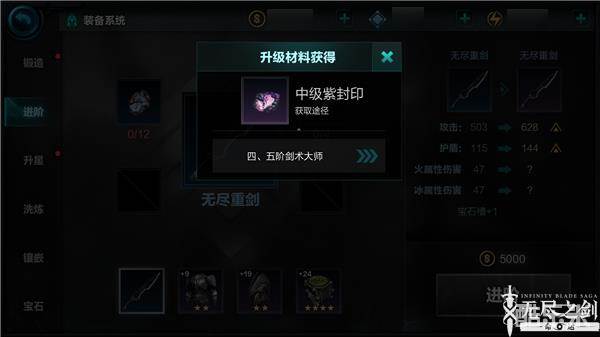 当然升级紫色装备也不会太容易,需要一定的道具。例如40级以下的装备由蓝色进阶紫色需要初级升阶石12个,初级紫封印4个。40级以上(包括40级)装备由蓝色升级为紫色需要12个中级升阶石,4个中级紫封印。这里以升级40级武器无尽重剑为例子给大家说明一下。登入游戏点击装备进入装备背包,查看挑选一件自己觉得合适的装备(同样的装备附加的属性可能不一样,有加冰系攻击,有加火系攻击,有加毒系攻击等,且附加的数值也不一样,可以根据自己的战斗习惯和需要进行挑选)。挑选好以后选择装备到自己身上,在点击装备再点击锻造进入装备系统,也可以退出装备背包点击主界面的强化进入装备系统。进入装备系统后点击进阶,选中需要进阶的装备。即可看到进阶所需的材料。如果满足所需材料和游戏币即可直接点击右下角的进阶完成装备进阶。