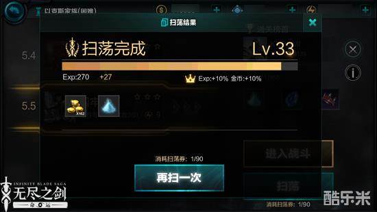 扫荡关卡所需的必备道具。9级将解锁扫荡功能,可以自动扫荡本章节所有已挑战成功的普通关卡。这个在无尽轮回模式是非常好用的,可以获得金币、材料等奖励。而且一键扫荡带来的真是满满的喜悦感。无尽轮回采用九宫格迷宫式玩法,玩家每次可以移动一格,从底层向上逐步探索,移动的总步数没有限制。每一轮回中都有9个怪,5个战斗记忆,3个宝箱,以及若干个随机事件。轮回中只要击杀BOSS即可完成本次轮回,不要求杀光所有怪物。击杀怪物会提高轮回完美度,完美度100%会获得额外奖励。使用一键扫荡真是满满的喜悦感,方便快捷啊。