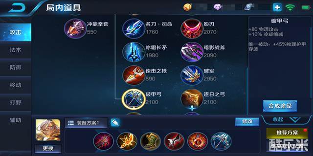 破甲弓不仅给予了后羿所需要的物理攻击,附加的冷却缩减使得后羿更频繁的使用技能(三技能开团留人),且破甲弓的物理穿透效果使得后羿打坦能力提升,再肉的英雄在后羿面前也撑不了多久。