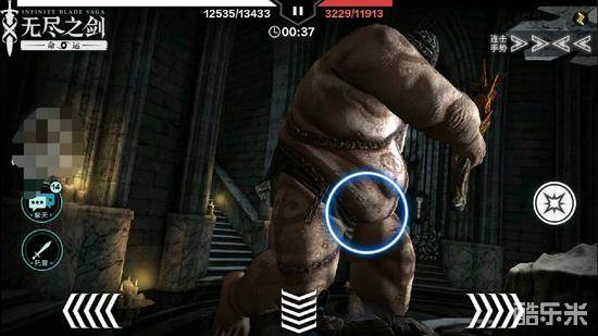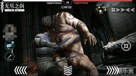 BOSS的第一段攻击,一般是下劈接左上向右下的斜劈,最后就是由右到右的横劈,速度很慢。抓住时机,玩家用↑↖→的手势可以完美格挡,然后就是3秒钟的眩晕时间,抓紧时间按照屏幕右上角的连击手势打出连击伤害!