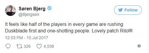 Doublelift绝对不是唯一对这个版本不满的职业选手,因为这个版本穿甲流得到大幅加强,德拉克萨的暮刃成为了最强的装备,这件装备基本上等于完全重做了,更低的价格和更高的伤害。这导致,一场游戏中所有的物理输出英雄都选择德拉克萨的暮刃作为第一个大件,无论你是刺客、射手甚至半肉战士。