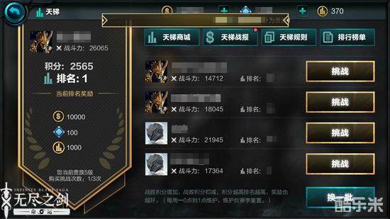 1.每天5次免费次数进入天梯赛挑战左侧列表的对手,选择挑战或者换一批对手进行单人PK,这些对手在排名、战力上多半与自己旗鼓相当或相去不远。战胜积分增加,战败积分扣减,若战斗超时则算挑战方失败,连胜10场以上将有额外加分。