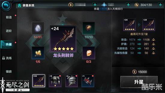 装备锻造:通过花费金币和特定的锻造材料对装备进行锻造,会有大量的属性加成从而提高装备的战力。武器锻造材料可在剑术大师任务中获得。