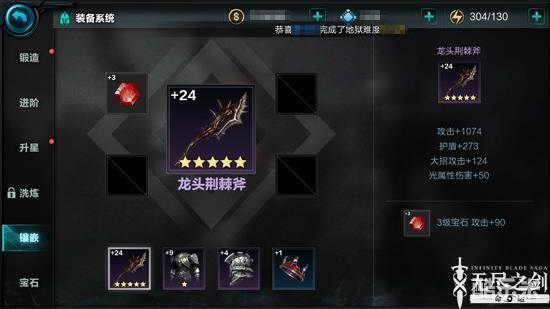 装备镶嵌:武器、防具上可以镶嵌宝石,如在龙头荆棘斧上镶嵌3级宝石,会有攻击+90的加成。同属性等级的宝石数量达到3个,可升级为更高一级的宝石1个。