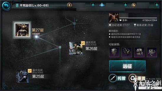 在《无尽之剑:命运》中,玩家角色等级决定着能够在不死远征中挑战层的多寡,在玩家等级达到60级时,最高层就是第27层!在这不死远征第27层中,可掉落奖励众多,但BOSS的难度也很高,能不能拿到就要看勇士自己的实力了!