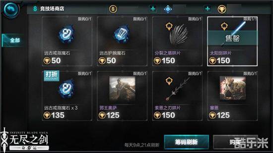 太阳剑神器,在《无尽之剑:命运》中需要通过收集10个太阳剑碎片去合成,成功合成后就能解锁太阳剑神器外观。太阳剑碎片获取途径包括竞技场商店和召唤神器,其中竞技场商店中除常规售价外,还有特惠、打折概率出现。