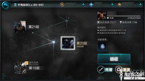 《无尽之剑:命运》不死远征系统中,挑战到20层的玩家相信都是有着一定实力的勇士,而这个关卡中的BOSS并没有太多特色攻击招式,挑战难度也就称不上多高。这一关在奖励上,也比较普通,但想要登上更高层,这又是绕不过的一个关卡。