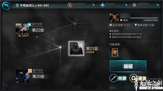 《无尽之剑:命运》不死远征第21层是特殊掉落层,有极大概率在成功击杀BOSS后掉落屠龙令。游戏中产出途径极为稀少的屠龙令,也是无数玩家想要的道具,也是玩家不断冲击不死远征更高层的原动力。除此之外,经验值、金币也能在击杀BOSS后结算时进行奖励。