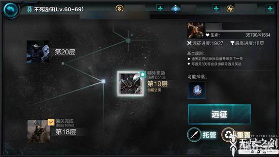 在《无尽之剑:命运》不死远征第19层中,是特殊奖励层,可选择一个个人觉得比较理想的BUFF效果。只要成功通关就有极大概率获得装备升阶基础材料升阶石,升阶石品级与玩家等级有一定联系,等级区间段越高品级越高。另外,成功击杀BOSS后,结算时必定获得经验值和金币。