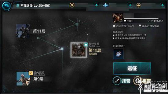 《无尽之剑:命运》中的不死远征第10层,是一个奖励层,在进入战斗后可优先选择想要的战斗BUFF,每种类型BUFF只能拥有1个,相同的BUFF效果可叠加,托管战斗中,系统会随机挑选其中一种BUFF给玩家角色。第10层中,BOSS是兽型,攻击花样并不多,但攻击伤害高,勇士最值得用剑盾攻击方式去挑战,毕竟盾牌可轻松抵抗BOSS绝大部分攻击。