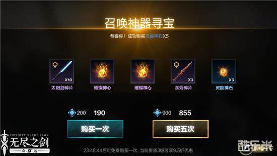 在《无尽之剑:命运》新版本更新上线后,竞技场商店出售物品进行了优化,将神器碎片加入其中,神器碎片正常售价为150荣誉币1个。另外,玩家还可以通过寻宝系统中的召唤神器来抽取神器碎片,单次购买达到一定次数必得神器,连续购买必得神器。无论是什么渠道获得神器碎片,集齐10个同类型神器碎片就可以合成对应神器。