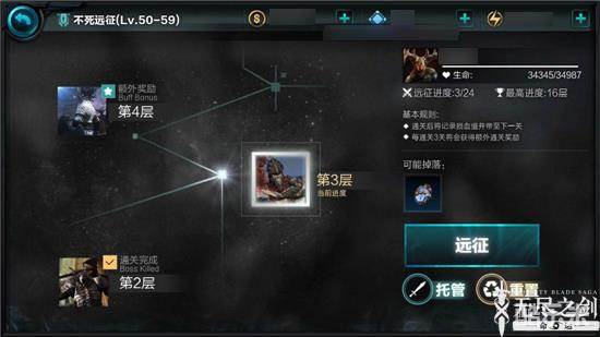 在《无尽之剑:命运》中,挑战不死远征第三层可概率获得升阶石(品质与角色等级有关),可用于提升装备品阶。在成功击杀BOSS后,还可获得经验值和金币,经验值与玩家角色等级有关,在获得的金币数量上,如果没有道具可能会较多,但产出了特殊材料后,可获得的金币数量反而会有所减少,毕竟材料更显珍贵!