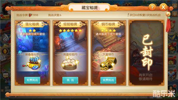 活动副本分为强化秘境,经验秘境,铜币秘境,分别获得装备强化石,英雄经验丹以及铜币。