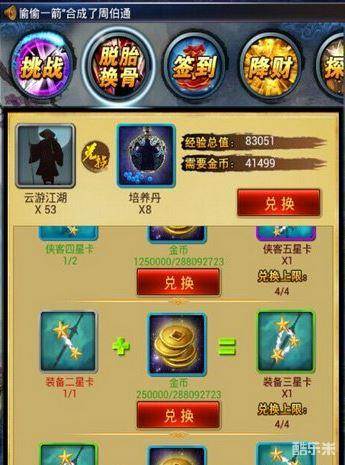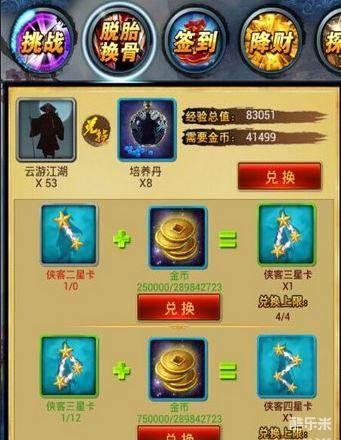 二、可以用自己的星卡加金币换取比自己星卡高一星的升星卡。有数量限制的,根据V等级兑换数量不一样,最高兑换12次。