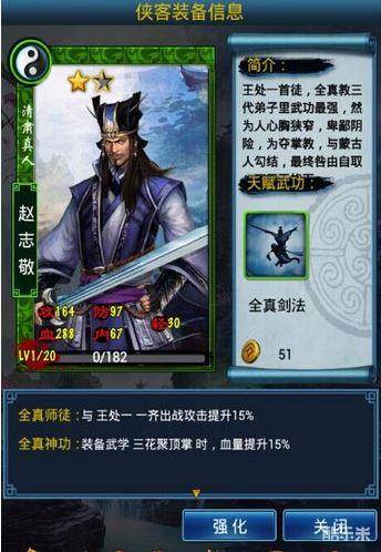 东邪西毒赵志敬弟子属性具体讲解,东邪西毒王处一首徒,全真教三代弟子里武功最强,然为人心胸狭窄,卑鄙阴险,为夺掌教,与蒙古人勾结,最终咎由自取。