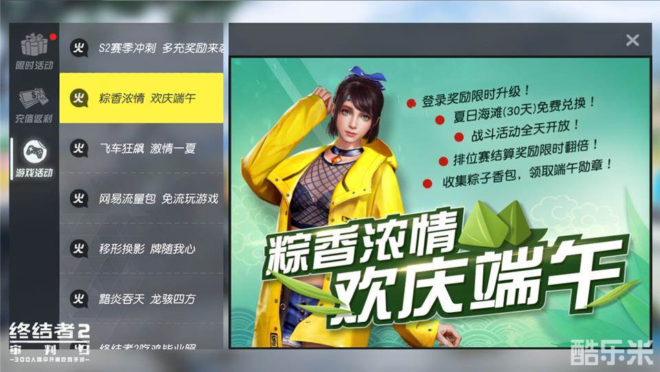 端午节期间,登录奖励限时升级,夏日海滩时装和端午节头像框开启活动兑换,战斗活动全天开放,排位赛金币奖励限时翻倍,还将掉落粽子、香包等特殊道具,完成任务还可获取额外端午节徽章!