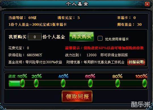 玩家等级达到35级后,将可花费一定金额的元宝购买1份或者多份基金(最多不超过50份),然后在游戏中获得指定的经验数量并达到相应战力要求即可获得投入元宝120%的收益。