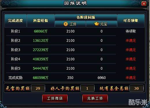 在获得经验的过程中,还可获得5次额外附赠的个人工资奖励,不需要任何付出。最终还可获得优惠兑换工资的机会,可用更少的元宝兑换更多的工资。