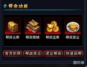 帮派宝库为帮派公有财产,其数值与帮派财富等值,其来源当前有帮派战、攻城战及帮派神兽,具体规则如下: