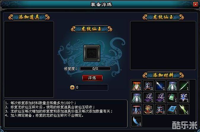 放入“龙纹仙玉碎片”后,就可以使用右下角中蓝色,紫色,橙色的装备或者道具进行修复,每种颜色的装备增加的修复度都是不一样的,当修复度达到了1000以后,就可以取出已经修复的“龙纹仙玉”。使用后就能够4399获得自己职业的60级橙色装备一个。