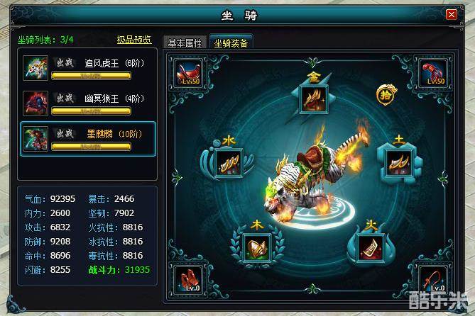 1.坐骑装备包括“御风”和“五行”两套系统,每一件装备都有各自的开放等级。