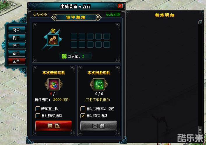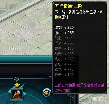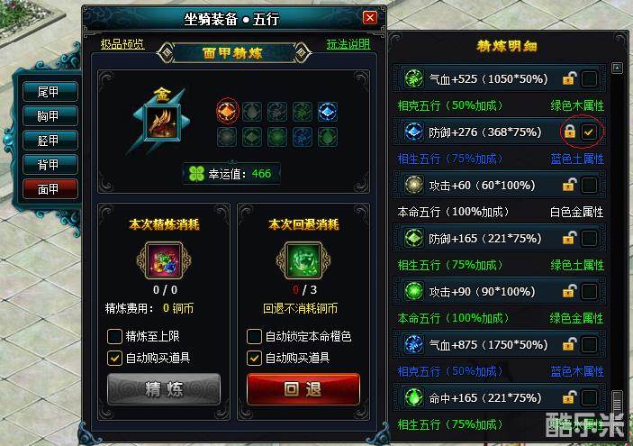 3.坐骑装备•五行是一个类似于洗练的玩法。它的核心在于重复“精炼”和“回退”的操作,在反复中不断获得更好的属性。属性的好坏,一方面取决于属性本身的颜色,另一方面则取决于属性的五行和装备自身的五行,存在怎样的生克关系哦。