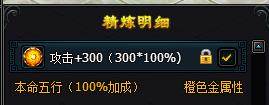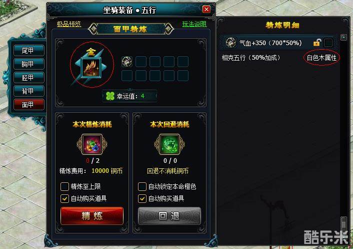 举例说明,在本次精炼中,我们获得了一条“白色木属性”。由于白色是很普通的颜色,而且面甲这件装备的五行“金”是克“木”的,所以这件装备上的属性仅获得了50%的收益,综合来讲,这是一条不怎么样的属性。
