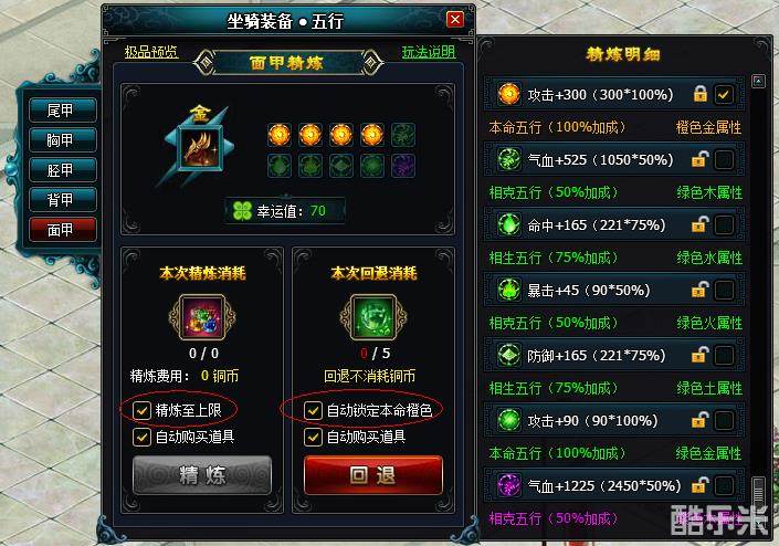 8.不断精炼回退,我们会累积越来越多的“本命橙属性”。如果您需要大批量地操作,我们建议您勾选上下图这两个选项,它将4399极大简化您的操作哦。不过,勾选这两个选项后,元宝也会被更快消耗哦~^_^