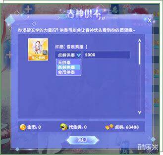 选择许愿物品后,点击“供奉并许愿”按钮,会弹出春神供奉窗口,