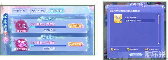 如果已助力的金币愿望实现,助力玩家将获得供奉量等额平分的代金券,点券愿望将获得等