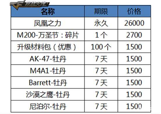 火线币商城也将紧随交易所系统脚步,在新版本中上架二十余款新品。其中限时上架的有8款,凤凰之力、M200-万圣节:碎片、升级材料包(优惠)、AK-47-牡丹 、M4A1-牡丹 、Barrett-牡丹、沙漠之鹰-牡丹以及尼泊尔-牡丹,玩家可通过消费相应火线币来获取这些限时武器道具。其中凤凰之力,玩家只需26000火线币即可永久拥有,机不可失!