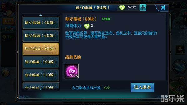 独守孤城活动每天只能参加两次,将军注意选择适合自己等级的阶段来进行挑战,点击进入副本就可以守护美人了。