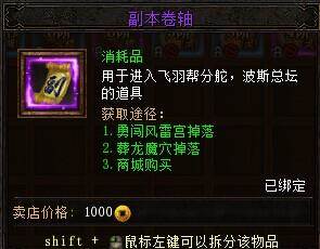 帮会贡献,不要乱换东西哦,注意换副本门票,没错,就是这玩意,当我们做完中午的祭旗之后,其实下午就等运镖了,所以有好几个小时在打怪,那么我们使用下图当中的门票进入BOSS地图,飞羽帮分舵。