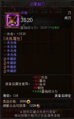 基础伤害3520,虽然这把武器是110的,但是紫装入手无门槛,一旦等级到了100之后,身上的橙装低于当前等级20,那么属性就会被紫装超过,看似很爽的6条洗练属性,在没有等级的支持下。
