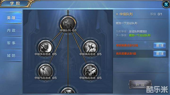 为了在同样的条件下掠夺到更多资源,到了开服第四天时,第三队列已该考虑开启。各位主君可通过升级学院-英雄-中级队列解锁第三队列。第三队列开启后,主君在城外掠夺资源时将变得更得心应手。