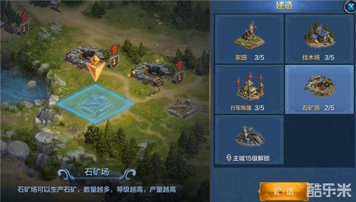 主城到达10级时,各位主君可以打开第四区域的资源田,在这里普及一下,资源田一共有六个区域,主君们初建城池的时候有两个区域是打开的,其他的区域随着主城等级的提升逐渐解锁。等到主城20级的时候方可解锁最后一个区域。这里要介绍的是第四区域的资源田,一般情况下这个时候伐木场、农田、行军帐篷的建造都已经达到上限了,但主城10级时会解锁石矿场,可以在这块区域中集中建造石矿场。建好之后可以先免费给每个石矿场升级,推荐主点一个石矿场进行升级,因为后续会成为主城升级的前提条件。