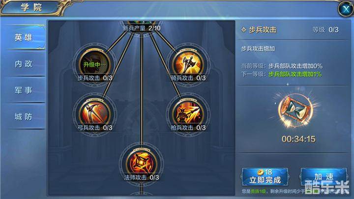 此时,学院科技方面有个很少有人注意的点,尤其是在点科技方面比较随性的主君,点开学院推荐哪个就点哪个了,这样做容易在前期会错过很好的科技,很有可能跟敌人战力相近的情况下被打败。例如第五章剧情任务中有学院研究-初级队列,当研究完成后,应该有目的性的去研究科技,此时主君可回顾目前拥有哪些英雄,因为士兵上阵的前提是英雄,主君应该根据英雄研究科技。例如有花木兰就可以先升级枪兵攻击,有程咬金和荆轲就可以升级步兵攻击等等。