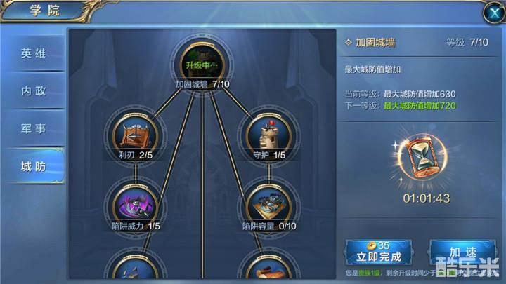 城墙养护的第一条就是升级,当然,城墙升级涉及主城升级的问题,所以一般问题不大。那么,除了升级之外还能通过哪些途径来加固城墙呢?答案就是学院。学院内的城防科技中有关于“加固城墙”这一项,初级的“加固城墙”共分10级,研究时间较短,每一级可增加城墙90点城防值,合计900城防值;“高级加固城墙”分15级,每一级可增加城墙140点城防值,合计2100。相对而言,学院和研究时间要求较高,如果把两款加固全部研究满,则可以增加城墙3000点城防值,而在初期的时候,12级的城墙城防值是1600,如果“加固城墙”学满,则相当于增加了城墙56%的城防值,数字也相当可观。