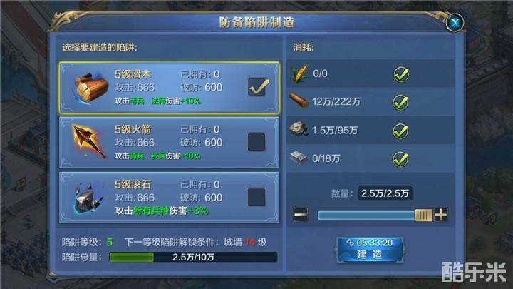 每次遇袭之后,陷阱都会随着城墙的破损而消耗殆尽,所以灾后重建工作也是相当的严峻。陷阱的建造时间相对较长,一般来说建议白天的时候建造,预计好差不多的时间建完之后再建另一个,当然,主君们在建造陷阱时,也可以选择建造的陷阱数量,来减少建造所需要的时间,尽量保证每种陷阱都有足够的数量。陷阱的等级跟城墙的等级挂钩,城墙升级则陷阱亦解锁更高等级,所以建筑的发展才是战力和城防建设的王道。