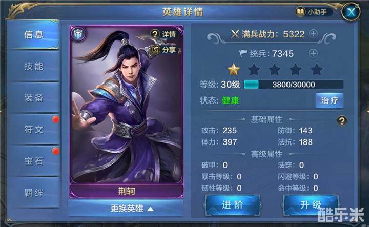 1.荆轲:在前期剧情任务中第二个获得的紫色步兵类英雄。