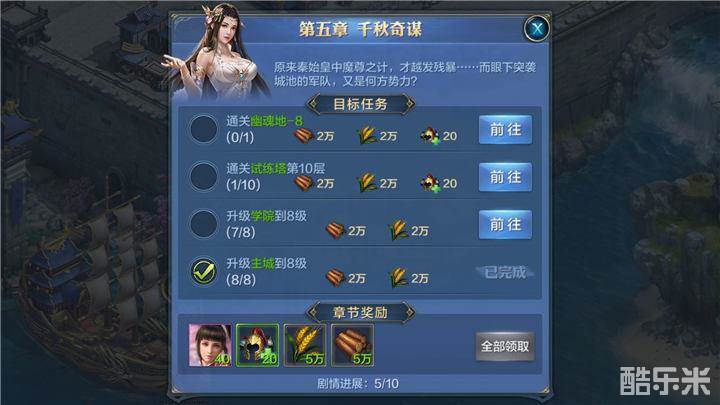 综合来说,第五章的剧情任务并不算困难,所有任务建筑的升级都能在1天之内完成。只是如果想要知道神秘老者是不是鬼谷子?中计后的秦始皇最后结果如何?还需要各位主君带着我们一起拨开重重迷雾。