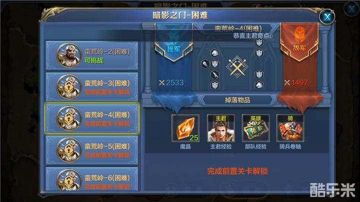 扫荡蛮荒岭困难-4,有几率获得骑兵卷轴-绿,骑兵卷轴-蓝:升级赵云技能风雪无痕、一身是胆。