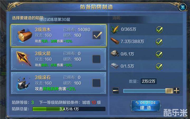 2、城墙:等级越高可做陷阱越多,陷阱的威力可以通过学院研究提升