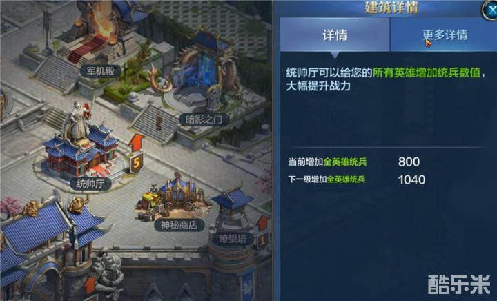 4、统帅厅:统帅厅也很重要,它掌控着英雄统兵的数量,统帅厅等级越高统兵数量越多。
