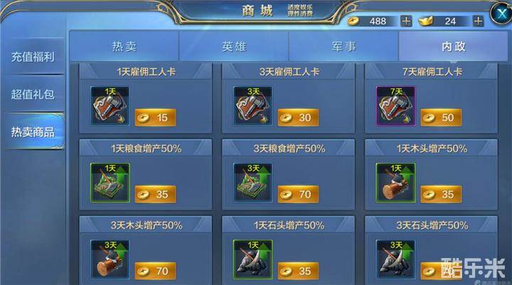 很多主君为了追求快速升级主城前期投入大量物资,建筑升级会导致后面采集资源有很长一段空档期。为避免这个情况,小编建议在升级建筑时间较长时,利用第二建筑队列升级农田、伐木场和石矿场。如果主君没有成为贵族可以花50金币购买七天雇佣工人卡,这个是最划算的,开启第二个建筑队列后,不仅可以升级建筑提升主君经验,升级资源田后也会明显增加日常生产资源数量。同时主君也可以购买资源增益卡提升日常生产资源的收入。