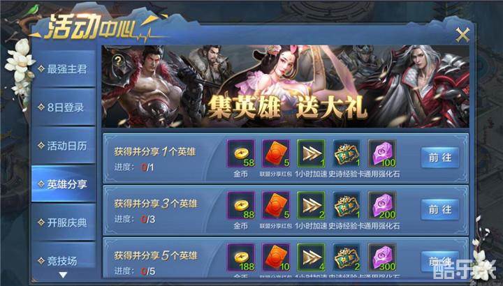 7.初期章节会免费获得紫色品质英雄,记得到活动中心分享英雄中领取福利。