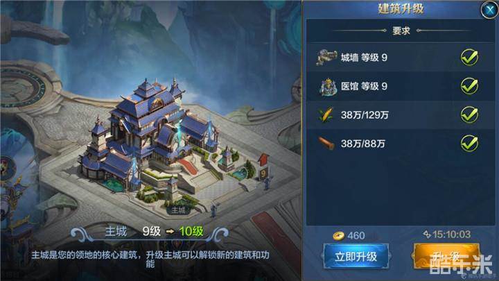9级主城升级10级前置建筑需求:城墙9级和医院9级。医院升级时间短使用加速卡秒升;城墙使用剩余加速卡后不足的用48金币升级;主城使用460金币秒升即可完成。