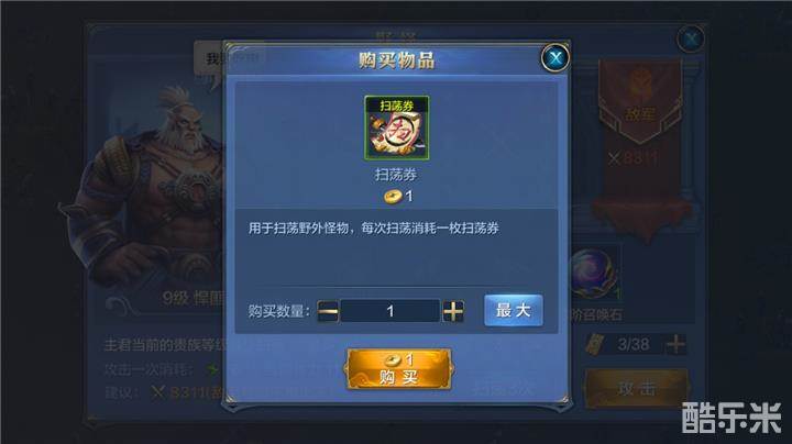 打野怪:每次消耗6点体力,体力会自动回复。扫荡一次野怪需要一枚价值1金币的扫荡券。