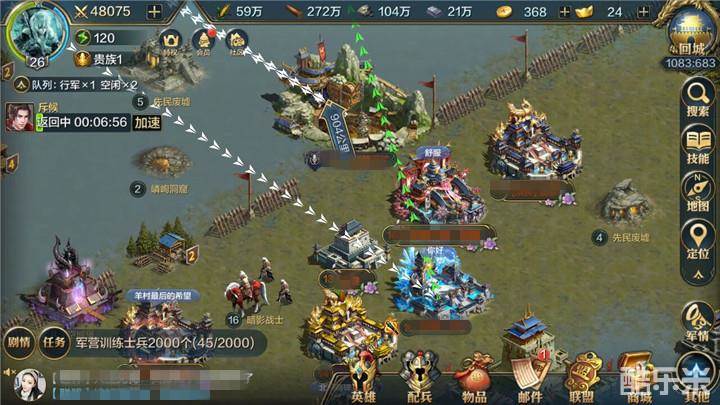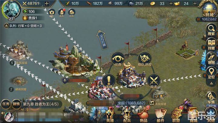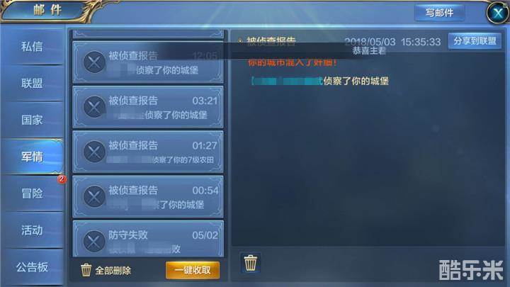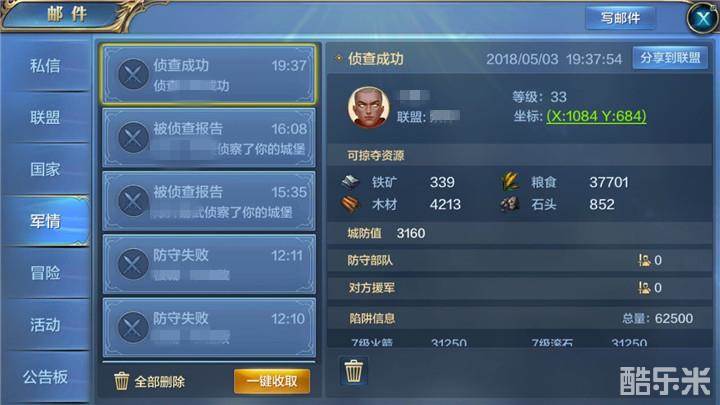 首先,找到你想要进攻的目标,点击之后,选择左上角的“侦查”,侦查所需要的时间视目标的距离远近而定,有条件的主君们可以使用行军加速来加快奸细的行军速度,避免贻误战机。当奸细侦查完成的同时会有一封完整的侦查报告发送至主君的邮箱,被侦查的目标也会收到一封警告他被对手侦查了的邮件,所以如果不想目标不易而飞的话,主君可要在侦查确定目标之后及时动手哦。