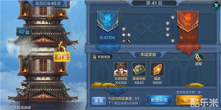 假如主君目前为33级,那么升到34所需要的经验就为24万。而打试练塔到40层能获得8万多经验,都已经足够升34级所需经验的1/3了。那么肯定就会有主君觉得,用88金币重置一回再获得8万多的经验岂不美滋滋?可惜这种想法是完全不可能的,因为重置之后,可获得的经验会减少了许多,每层可获得的主君经验只有(n*1)*10,也就意味着重置后可获得的经验只有前一次的10%。如果主君不缺装备和符文,单纯是为了获得主君经验,那么花88金币重置试炼塔的性价比并不高。